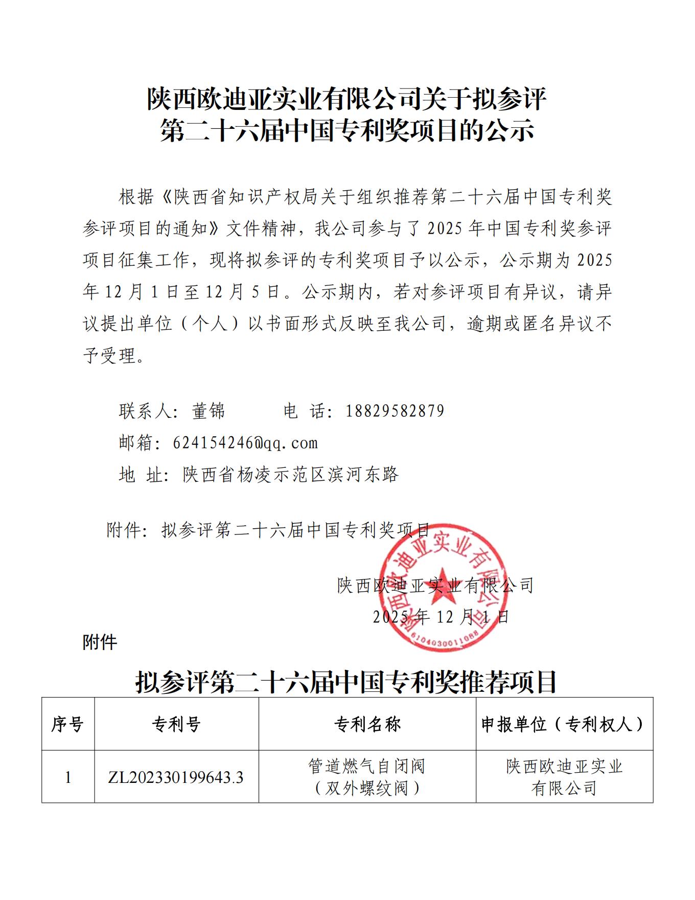 陕西欧迪亚实业有限公司关于拟参评第二十六届中国..奖项目的公示